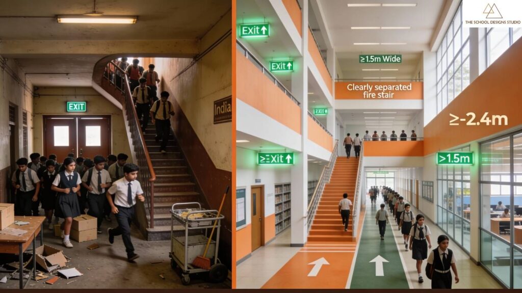 One of the most widespread fire safety problems in schools is inadequate, poorly planned exit routes. Narrow corridors, blocked passageways, and insufficient staircases can significantly slow down evacuation. According to the National Building Code (NBC 2016, Part 4 – Fire & Life Safety), educational buildings must have corridors at least 2–2.4 metres wide and staircases measuring 1.5 metres or more.