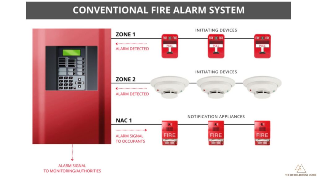 Many schools rely solely on fire extinguishers and neglect modern fire detection and suppression systems. NBC 2016 and state fire norms require: