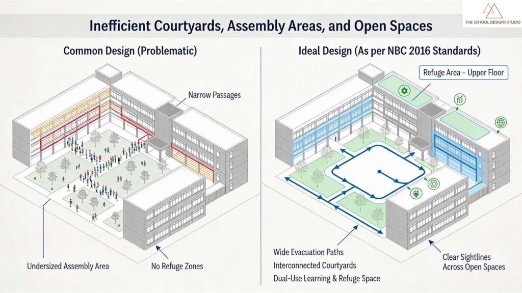 Many schools treat outdoor spaces only as recreational areas, overlooking their role in emergency management. Poorly connected courtyards, undersized assembly zones, or a lack of identified congregation points can cause confusion and crowding during evacuation.