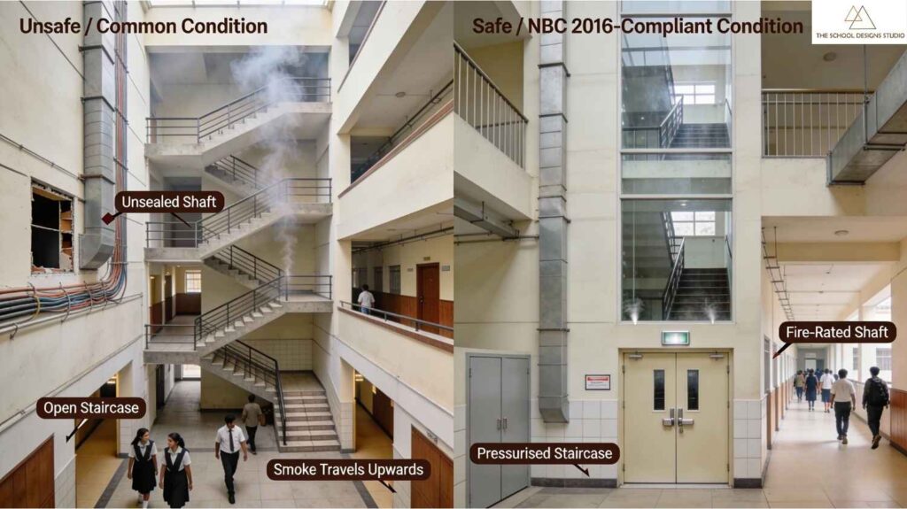 NBC 2016 requires pressurised staircases, 2-hour-rated shafts, and smoke management systems for multi-level educational buildings.