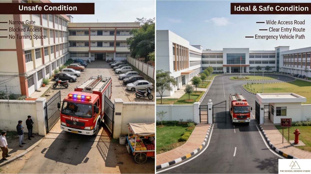 Fire department access remains one of the most neglected safety requirements in school campuses. Narrow gates, blocked periphery roads, and a lack of turning clearance prevent fire tenders from reaching the site quickly.