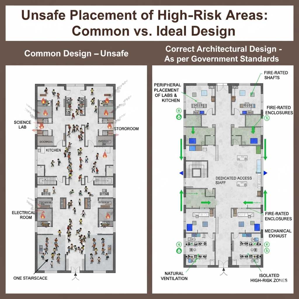 Another major oversight in school planning is the improper positioning of fire-prone spaces such as kitchens, science labs, electrical rooms, and storerooms. When these areas are located near classrooms or heavily occupied zones, they pose heightened risks.