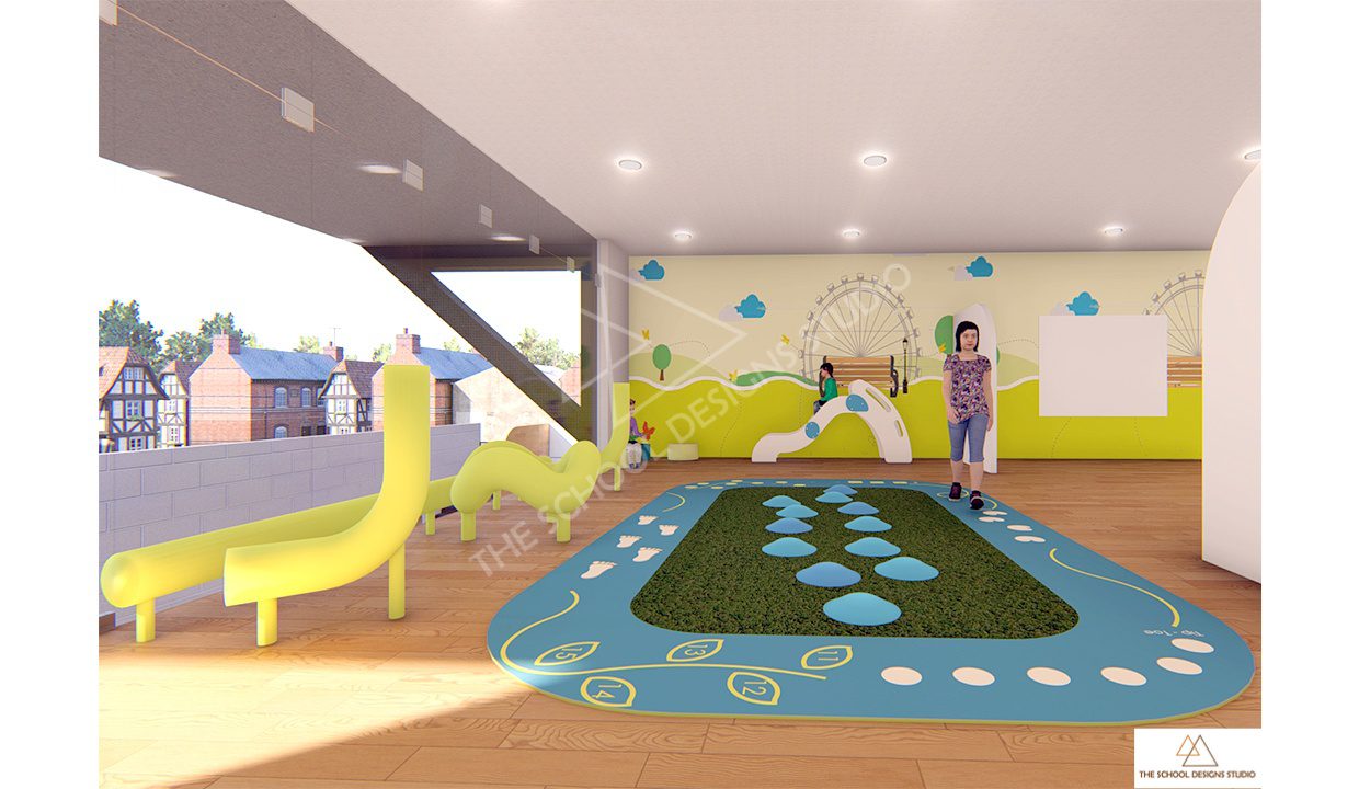 The Kindergarten wing was designed with bright and vibrant colors to create an inviting and stimulating learning environment for young children that includes classrooms, activity areas, and a playground that encourages hands-on and interactive learning. The outdoor play area includes a variety of play structures and activities that are tailored to the needs of young children like a playhouse, waterplay area, and car play area to promote physical activity and imaginative play.